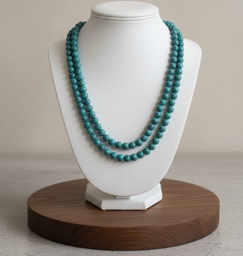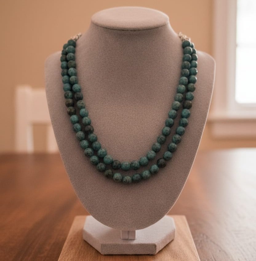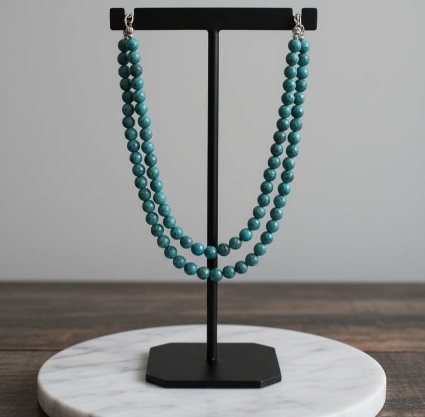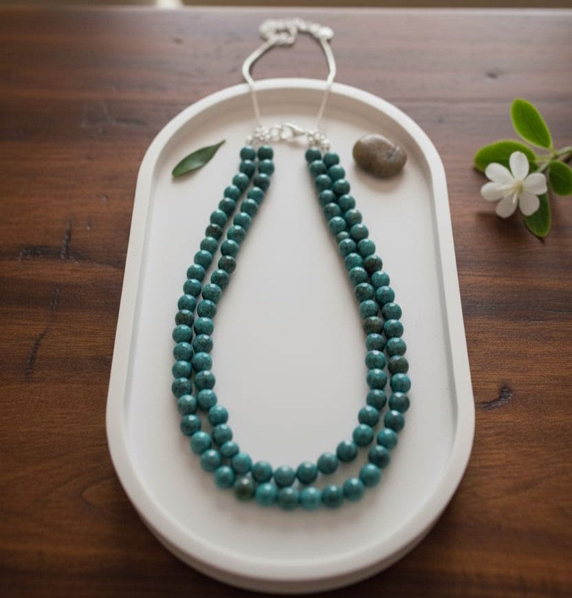 Introduce a serene pop of color to your jewelry collection with the Tranquility Necklace. This piece features a beautiful, finely speckled stone in a striking blue-green shade. The simple, uniform round beads are strung into a graceful double layer, providing a look of rich texture and dimension without being overly ornate. It’s the essential classic necklace for a polished look—pair it with a white blouse, a black dress, or your favorite knitwear for instant, understated chic.