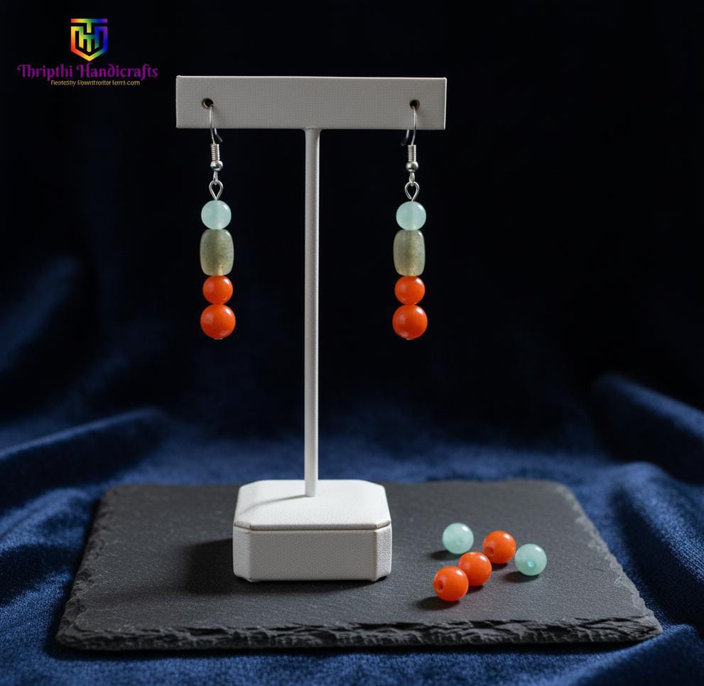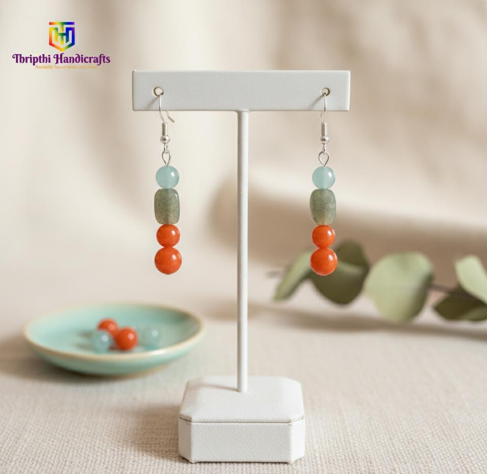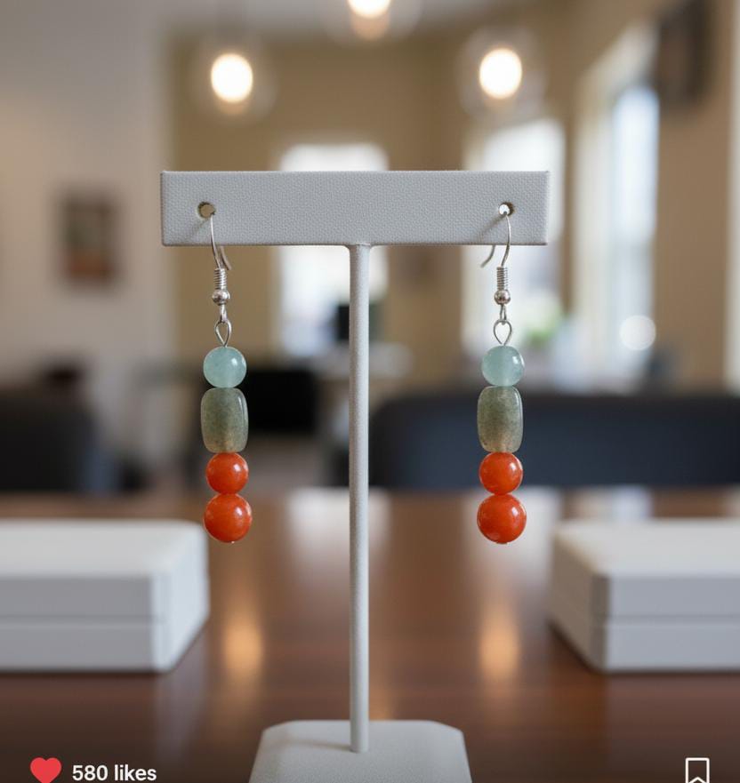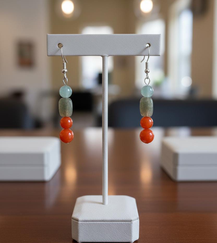 ​Design: A sleek vertical drop featuring a soft mint green bead, a translucent olive-grey stone, and a bold double-stack of vibrant orange carnelian-style beads. ​Materials: High-quality polished beads suspended on hypoallergenic silver-toned French hooks. ​Style: Contemporary Boho. The contrast between the cool mint and the fiery orange creates a visual balance that complements various skin tones. ​Weight: Lightweight and comfortable for all-day wear. ​Occasion: Perfect for brunch, office wear, or as a thoughtful gift for lovers of handmade jewelry.