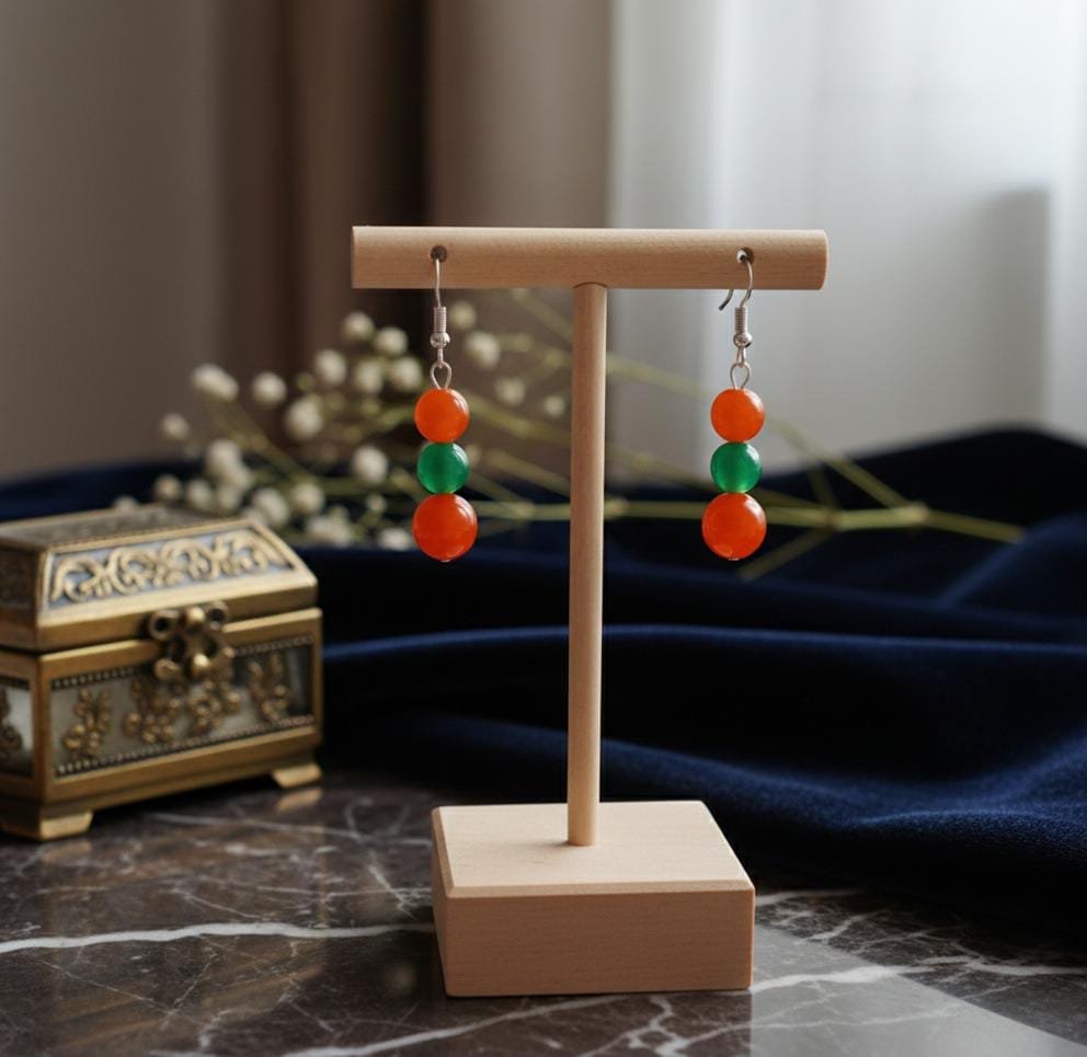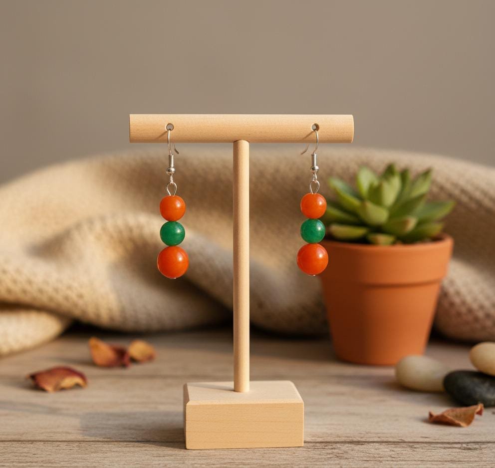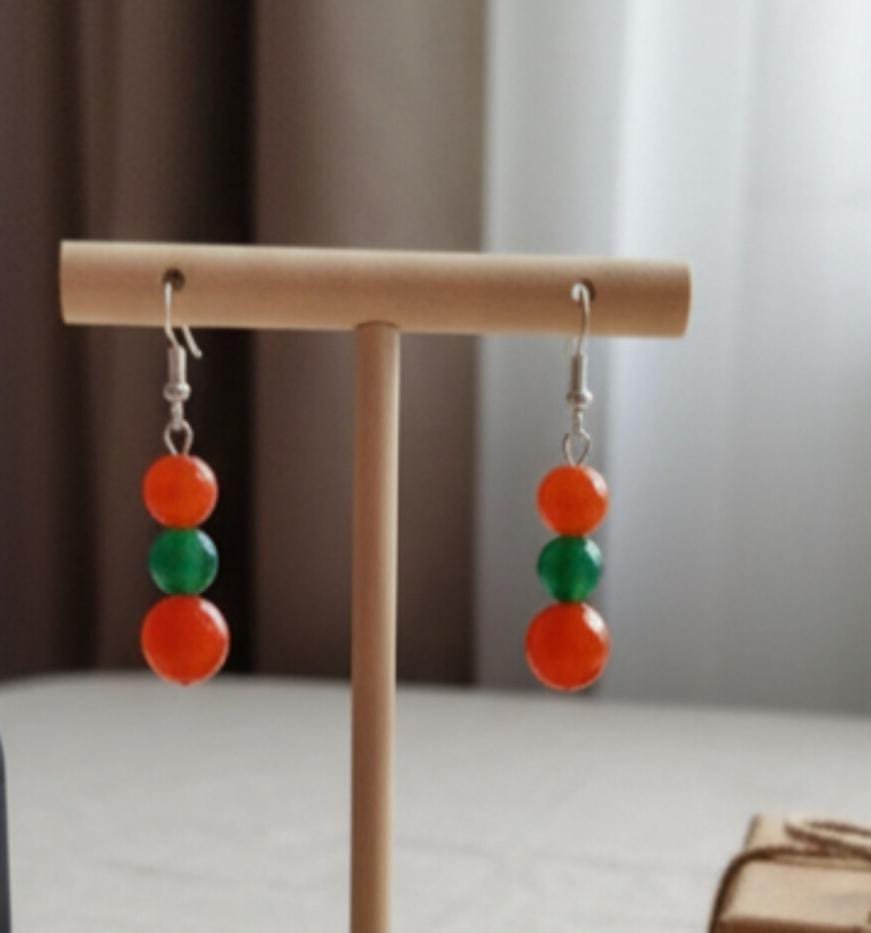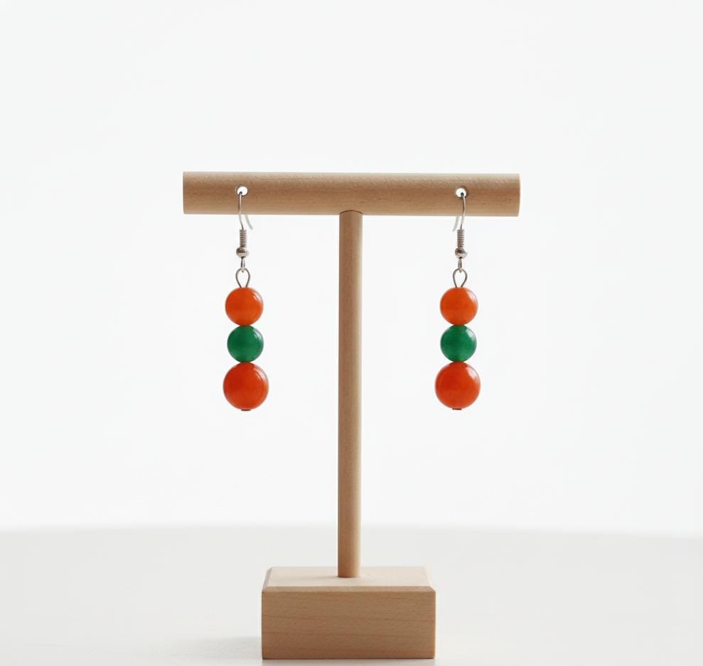 ​A radiant Rich Orange bead at the top, reminiscent of a glowing sunset or juicy tangerine. ​A striking Deep Emerald Green bead at the bottom, evoking the lush depths of a forest. ​This cheerful pair is completed with another Rich Orange bead at the very bottom, creating a playful and balanced drop.