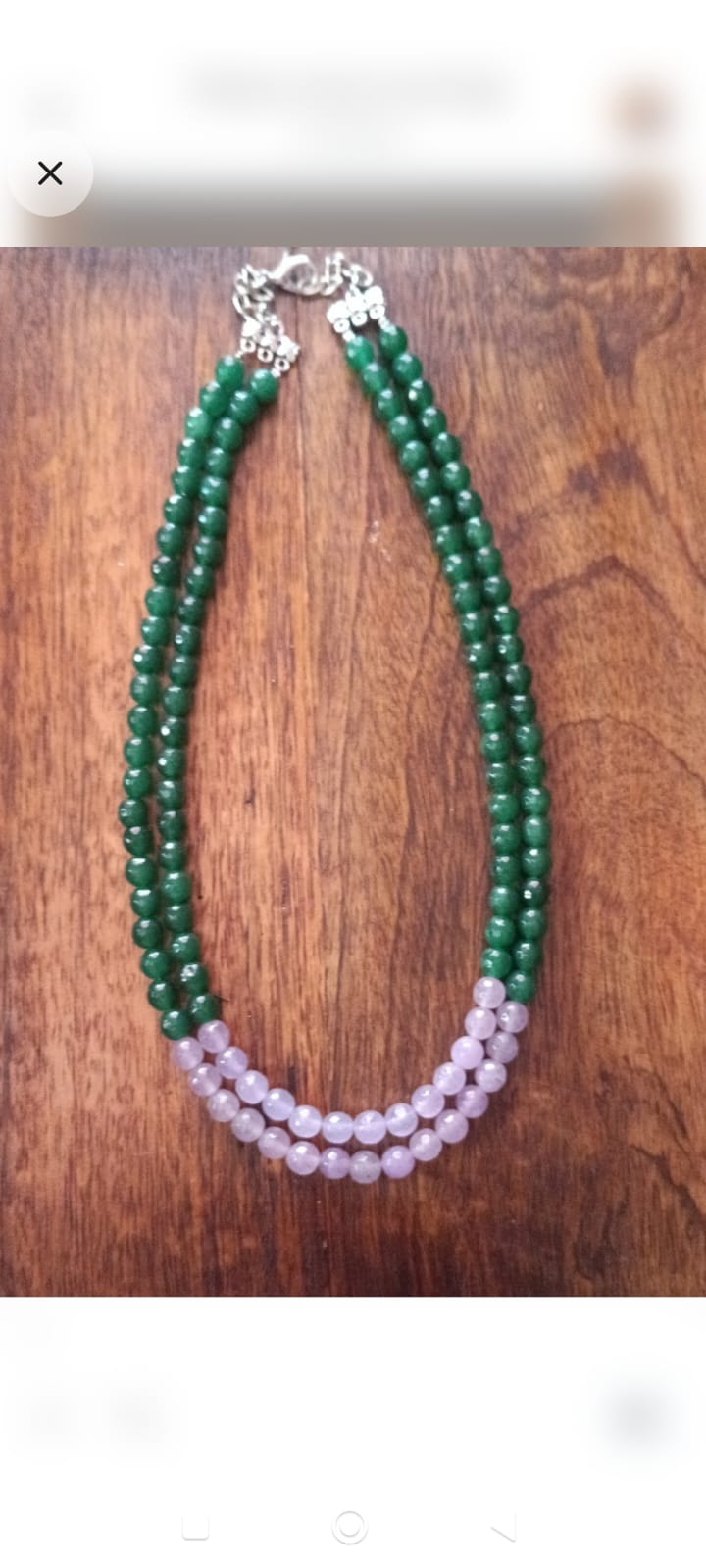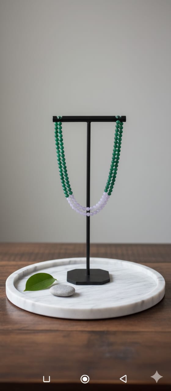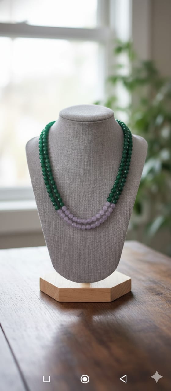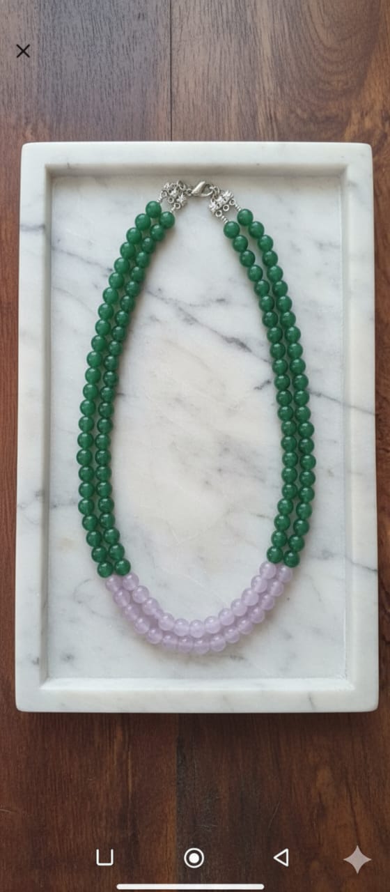 Design: A classic double-strand “mala” style, meticulously hand-strung for a graceful drape. Gemstones: Smooth, round Jade beads. The top portion features traditional forest green, while the lower “pendant” section transitions into a serene lavender hue. Craftsmanship: 100% Handmade by skilled artisans, ensuring every bead is perfectly placed. Hardware: Secured with a durable, high-quality silver-toned lobster clasp and adjustable chain for a custom fit. Style Tip: A versatile statement piece that pairs beautifully with traditional Indian ethnic wear (Sarees/Lehengas) or adds a sophisticated pop of color to a modern white linen dress.