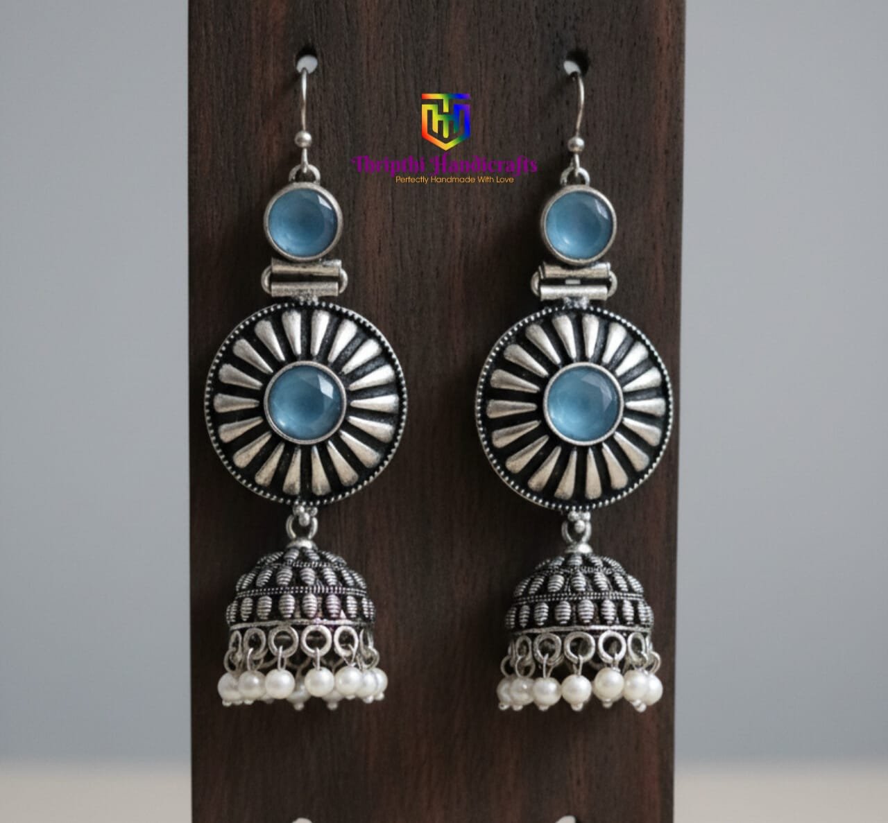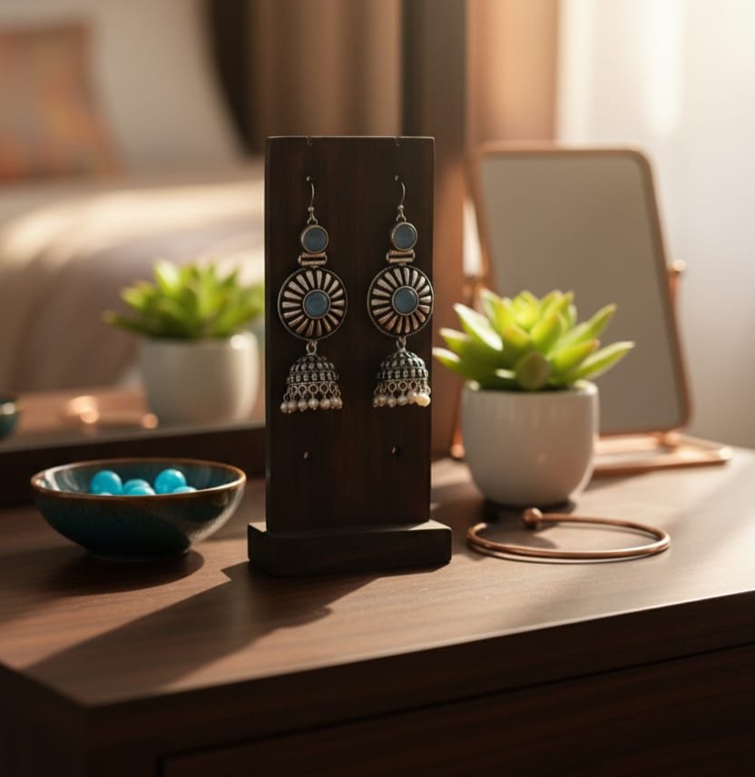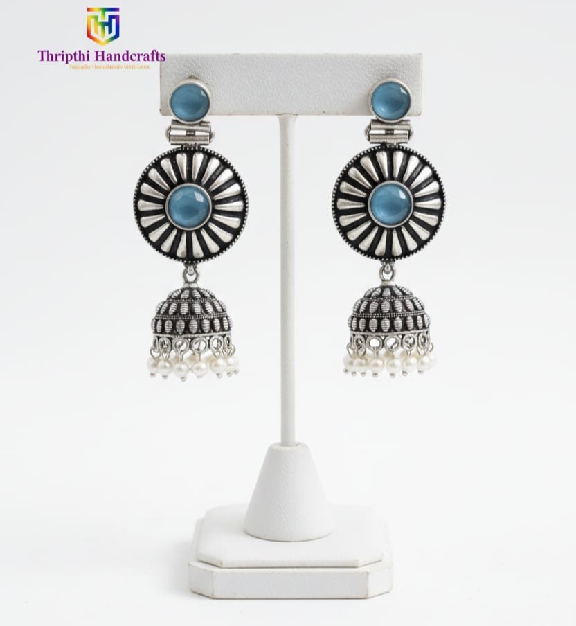 These intricately crafted oxidized silver jhumka earrings feature a timeless design adorned shimmering. The traditional dome-shaped jhumkas are embellished with delicate white pearl drops, offering a blend of classic and contemporary style. Perfect for weddings, festive occasions, or casual ethnic wear, these earrings are a must-have for every jewelry collection.