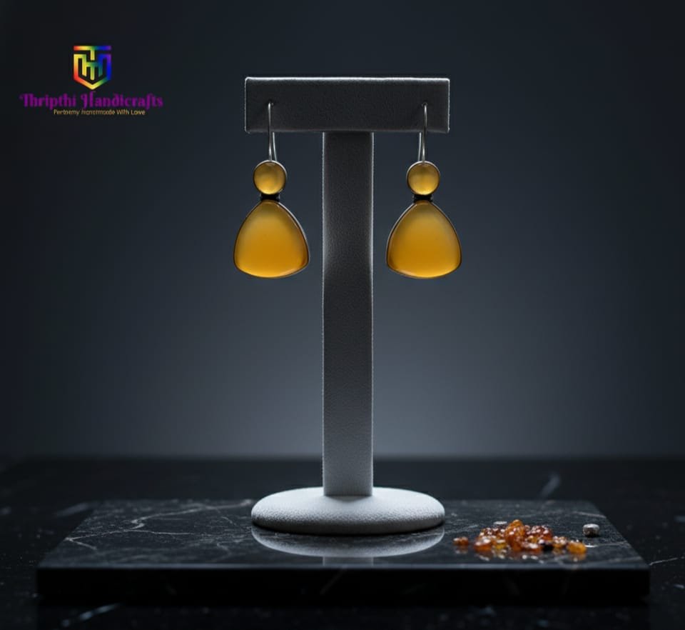 These exquisite dangle earrings are a perfect blend of modern design and timeless elegance. Each earring showcases a polished, deep honey-gold or amber-hued natural stone cut into a beautiful, soft triangular or shield shape. Above it, a smaller, circular stone in a matching warm tone adds a refined accent.